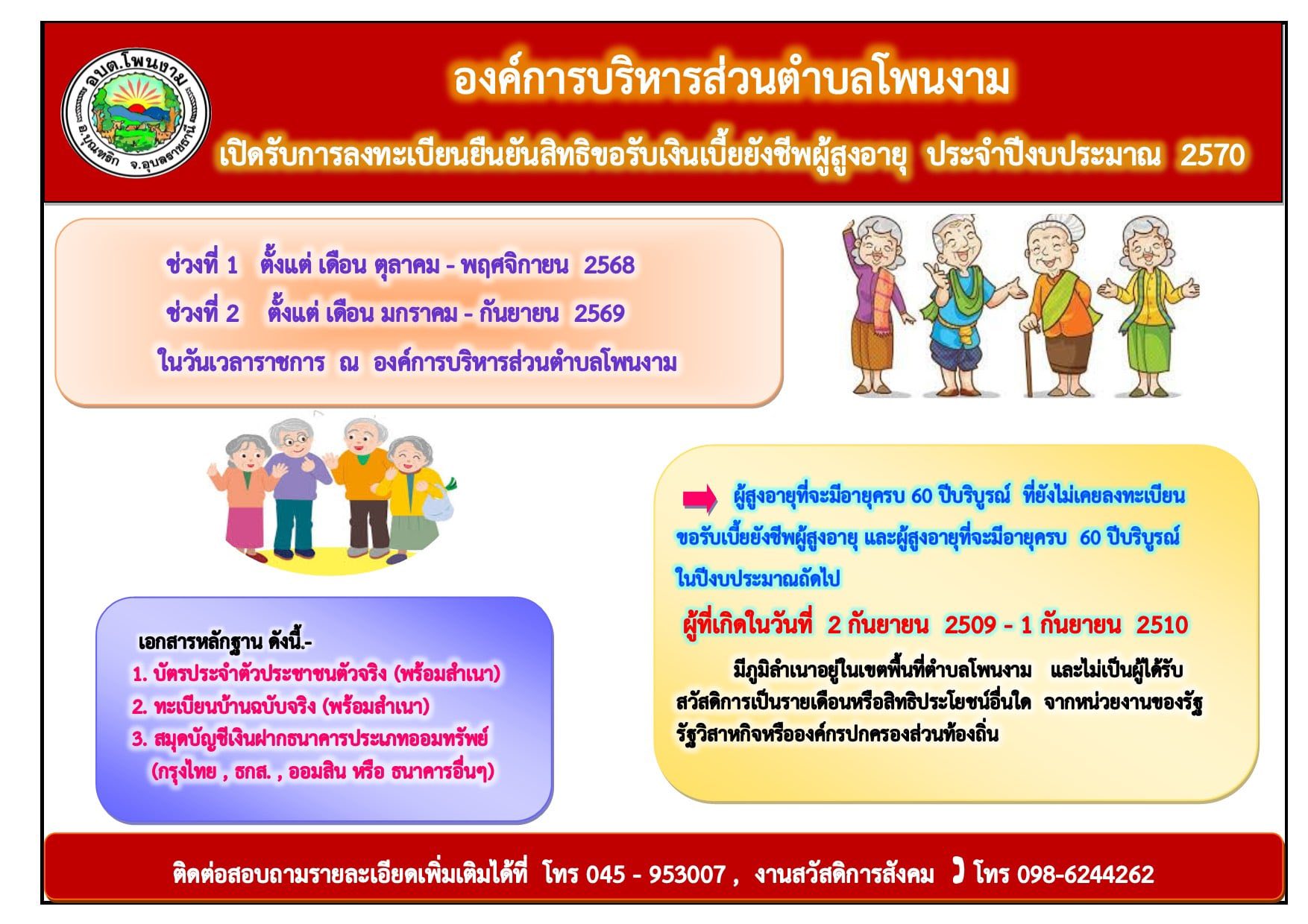 วันที่ 3 กันยายน 2568 ประชาสัมพันธ์ งานสวัสดิการสังคม องค์การบริหารส่วนตำบลโพนงาม เปิดรับลงทะเบียนยืนยันสิทธิขอรับเงินเบี้ยยังชีพผู้สูงอายุ ประจำปีงบประมาณ 2569 และ 2570