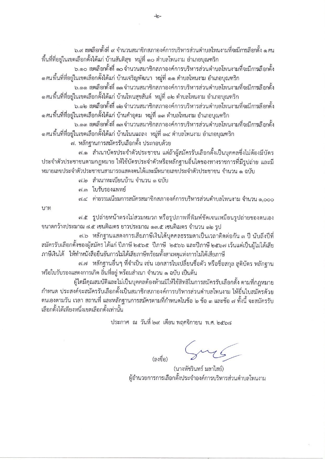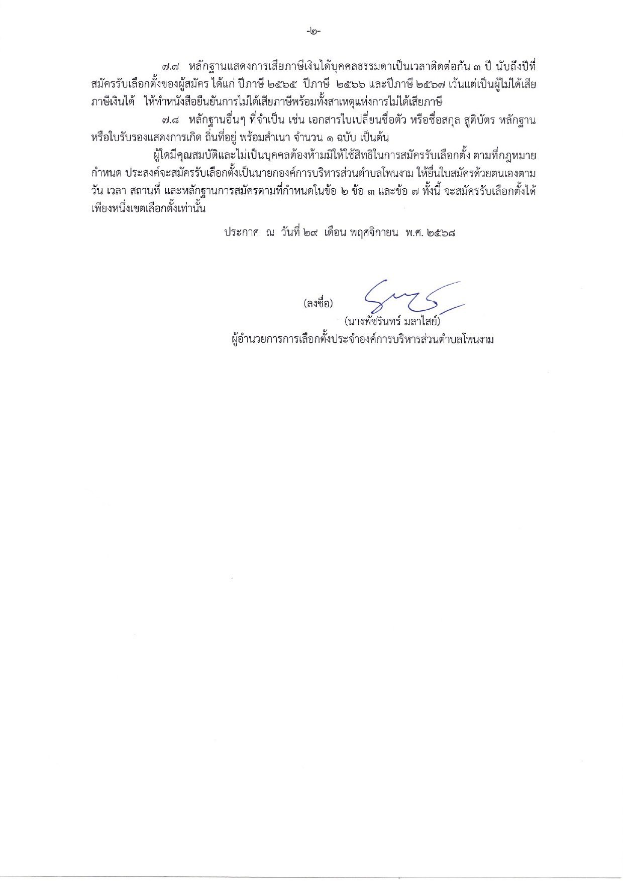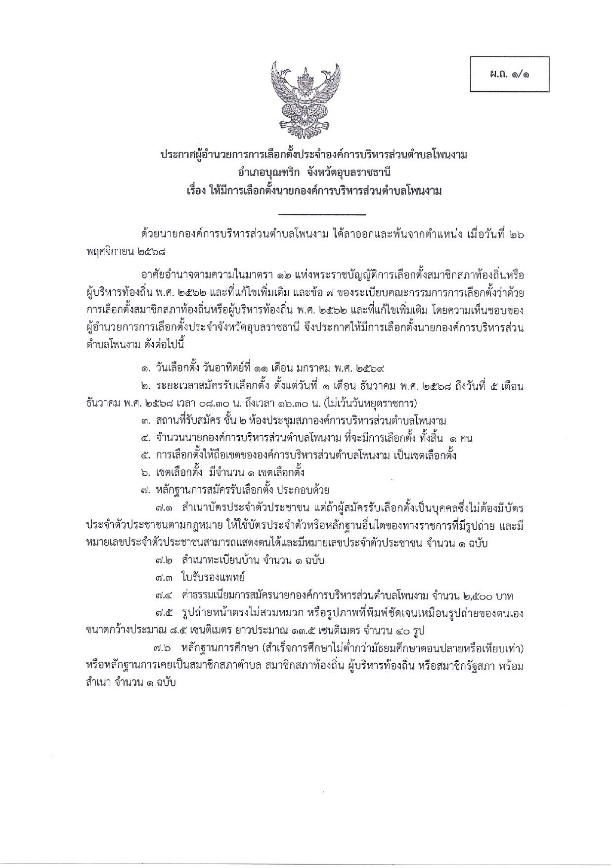 ประกาศให้มีการเลือกตั้งสมาชิกสภาองค์การบริหารส่วนตำบลและนายกองค์การบริหารส่วนตำบล ศูนย์ประสานงานการเลือกตั้งประจำองค์การบริหารส่วนตำบลโพนงาม จึงขอส่งสำเนาประกาศให้มี การเลือกตั้งสมาชิกสภาองค์การบริหารส่วนตำบลโพนงามและนายกองค์การบริหารส่วนตำบลโพนงาม โดย กำหนดการรับสมัคร ในระหว่างวันที่ 1 - 5 ธันวาคม 2568 เวลา 08.30 - 16.30 น. ณ ที่ทำการองค์การ บริหารส่วนตำบลโพนงาม หมู่ 7 ตำบลโพนงาม อำเภอบุณฑริก จังหวัดอุบลราชธานี เพื่อโปรดพิจารณาดำเนินการ ติดประกาศและประชาสัมพันธ์ต่อไป รายละเอียดปรากฏตามสิ่งที่ส่งมาพร้อมนี้