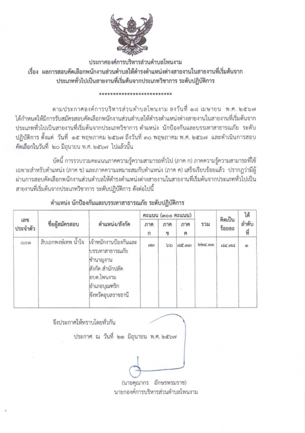 ประกาศองค์การบริหารส่วนตำบลโพนงาม เรื่อง ผลการสอบคัดเลือกพนักงานส่วนตำบลให้ดำรงตำแหน่งต่างสายงานในสายงานที่เริ่มต้นจากประเภททั่วไปเป็นสายงานที่เริ่มต้นจากประเภทวิชาการ ระดับปฎิบัติการ