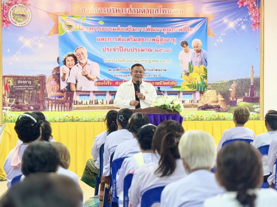 โครงการอบรมส่งเสริมการพัฒนาคุณภาพชีวิตและการส่งเสริมสุขภาพของผู้สูงวัย ประจำปีงบประมาณ 2568 ระหว่างวันที่ 22 - 24 กรกฎาคม 2568 ณ ห้องประชุมองค์การบริหารส่วนตำบลโพนงาม ท่านดร.คุณากร อักษรพรมราช นายกองค์การบริหารส่วนตำบลโพนงาม เป็นประธานในพิธีเปิดโครงการ